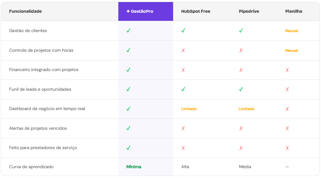 A maioria dos CRMs do mercado foi construída para grandes equipes de vendas. São complexos, caros, e cheios de funções que você nunca vai usar. O GestãoPro foi criado para uma realidade diferente — a do profissional que trabalha com projetos, clientes e serviços.